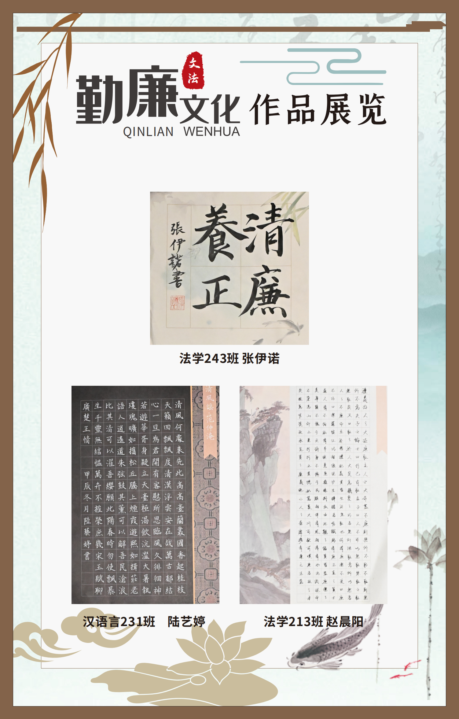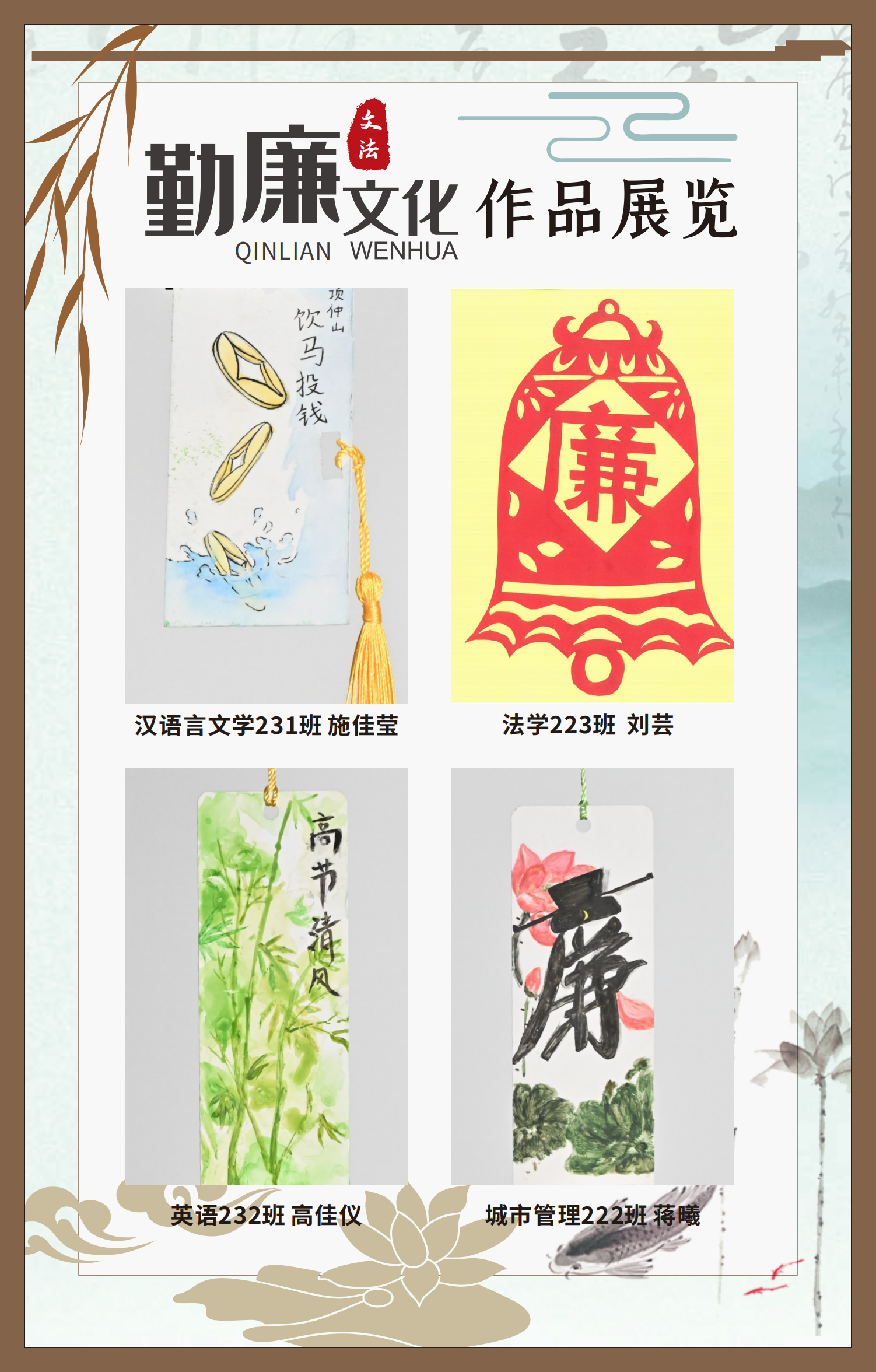 文法學(xué)院“步步生廉”文化走廊,植根于“六廉頌”清廉文化品牌,依托學(xué)院勤廉文化月活動,以師生清廉主題作品為媒介,系統(tǒng)呈現(xiàn)文法學(xué)院師生“知廉、守廉、促廉、倡廉”的實踐自覺,全景展現(xiàn)將新時代廉潔文化建設(shè)融入“立德樹人”根本任務(wù)的生動范例。